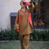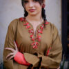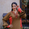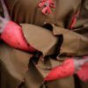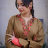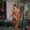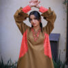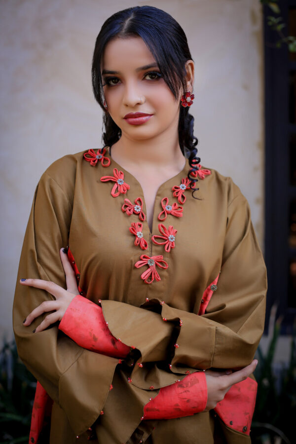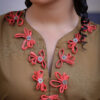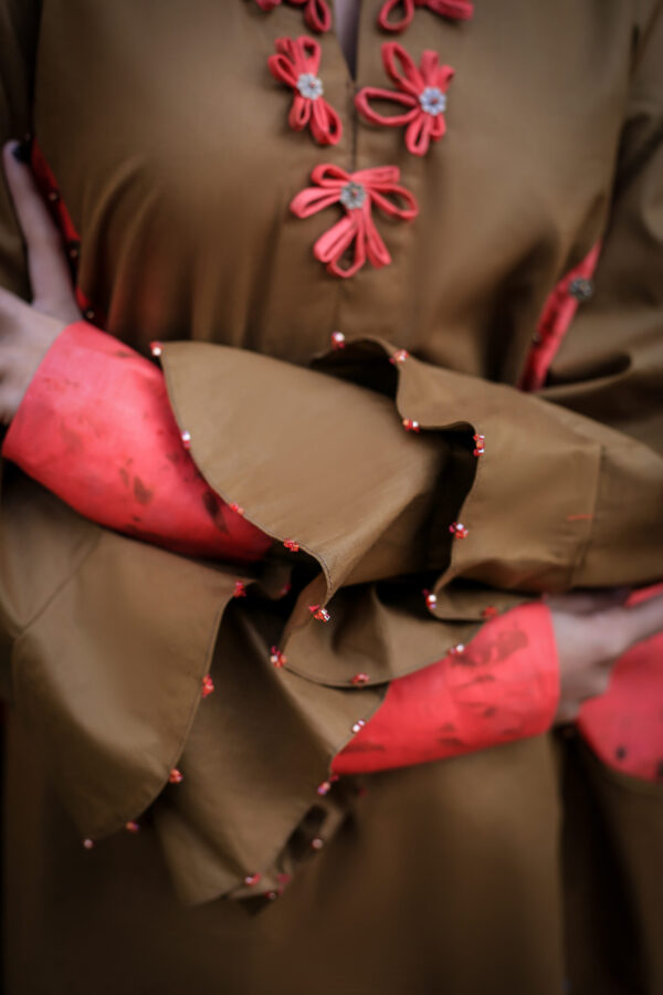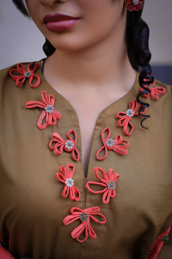 Discover the earthy charm of Auribear—an olive-bronze co-ord set that redefines fusion wear. Featuring vibrant coral floral appliqués on the neckline and statement tiered ruffle sleeves, this set paired with pleated dhoti-style pants is a masterclass in modern ethnic chic.