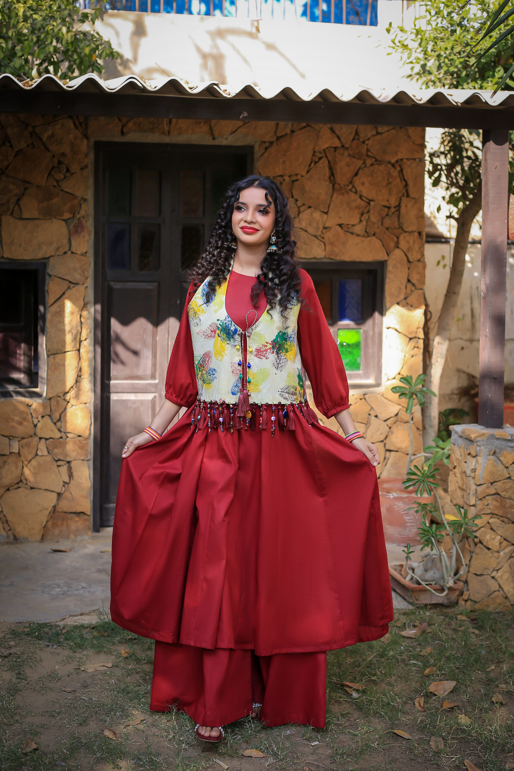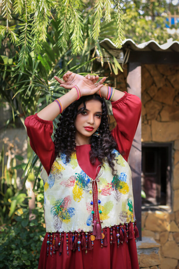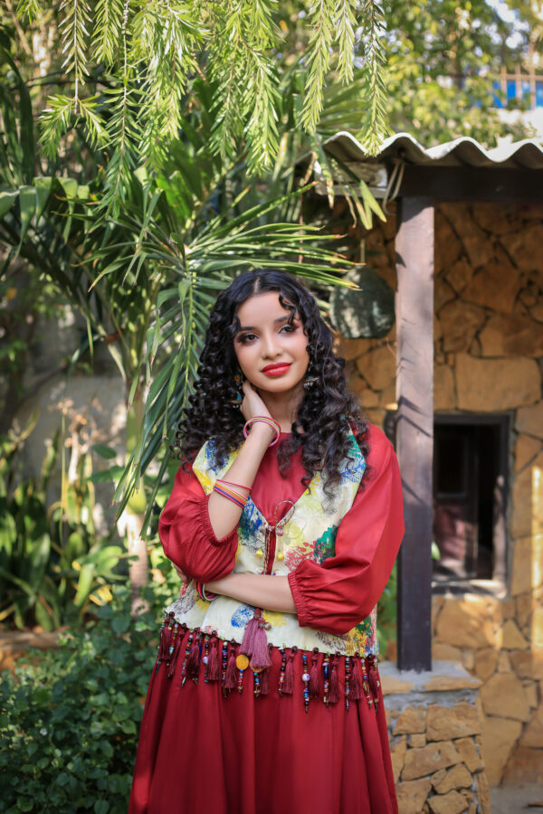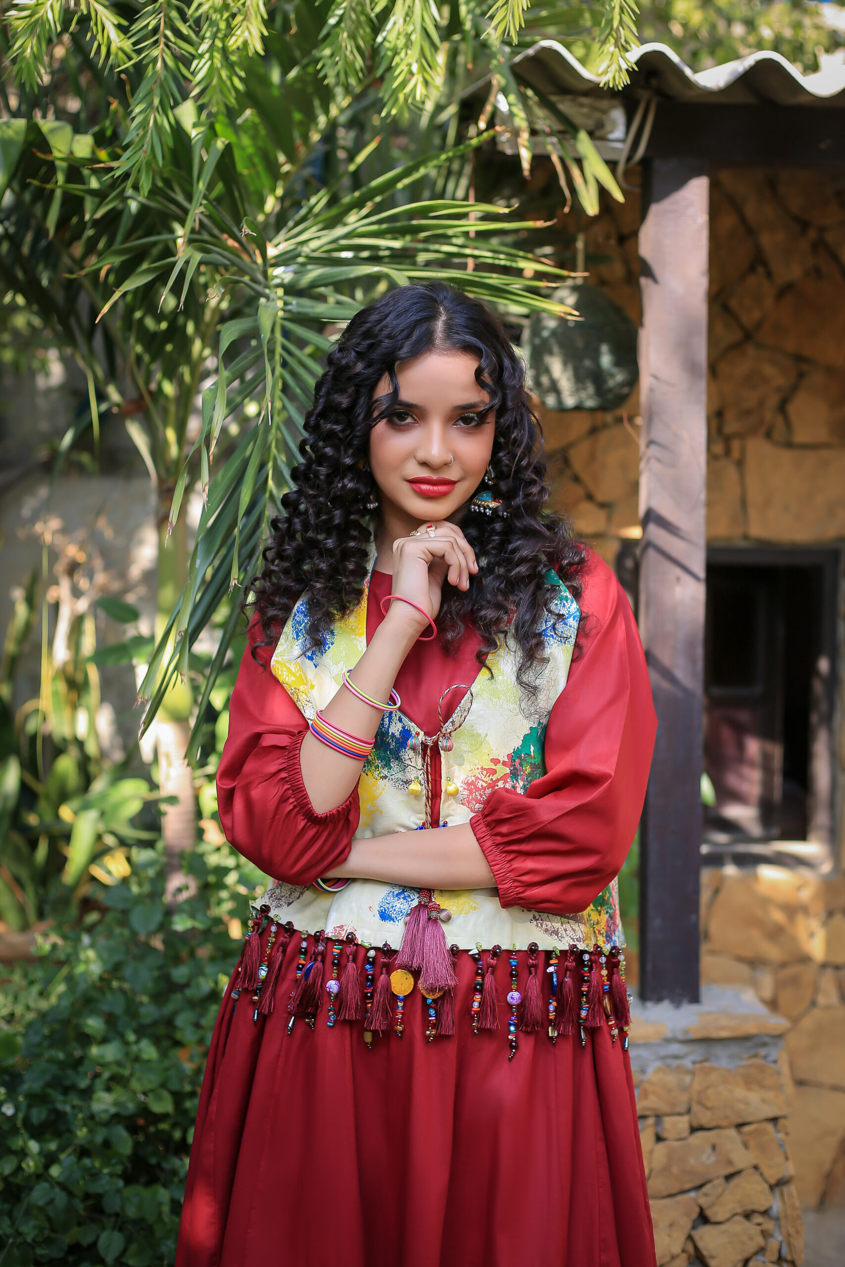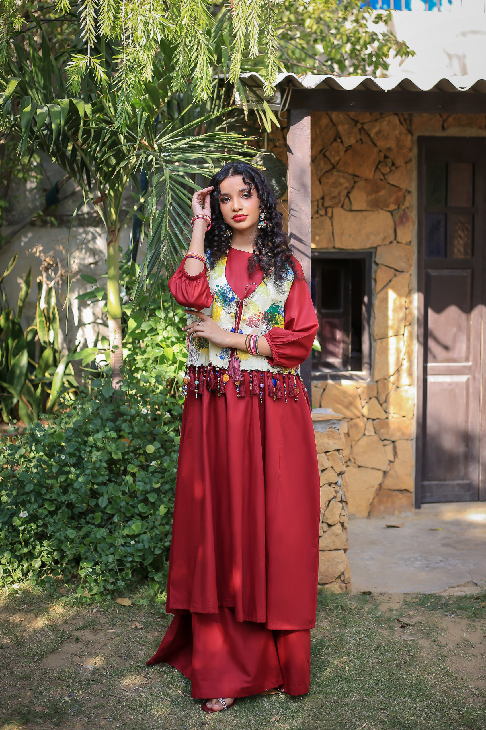 Make a bold statement with Ruby Foliage—a striking deep red ensemble paired with a vibrant, nature-inspired waistcoat. Featuring playful tassel detailing and a flowing silhouette, it’s the perfect blend of traditional charm and modern flair