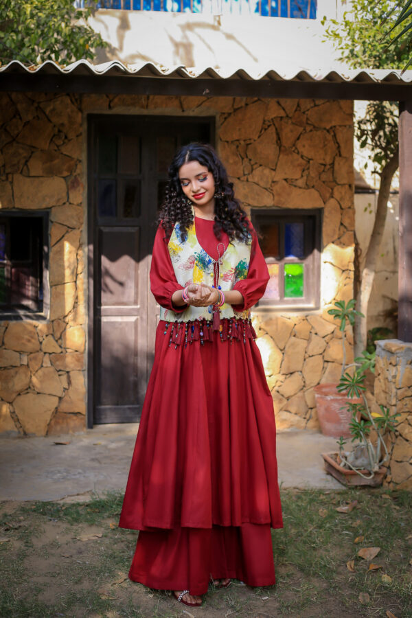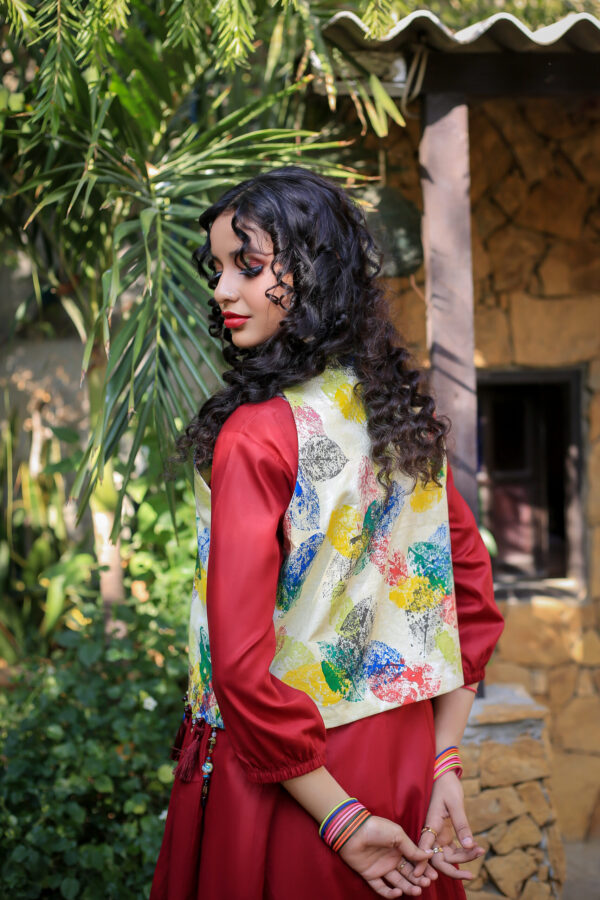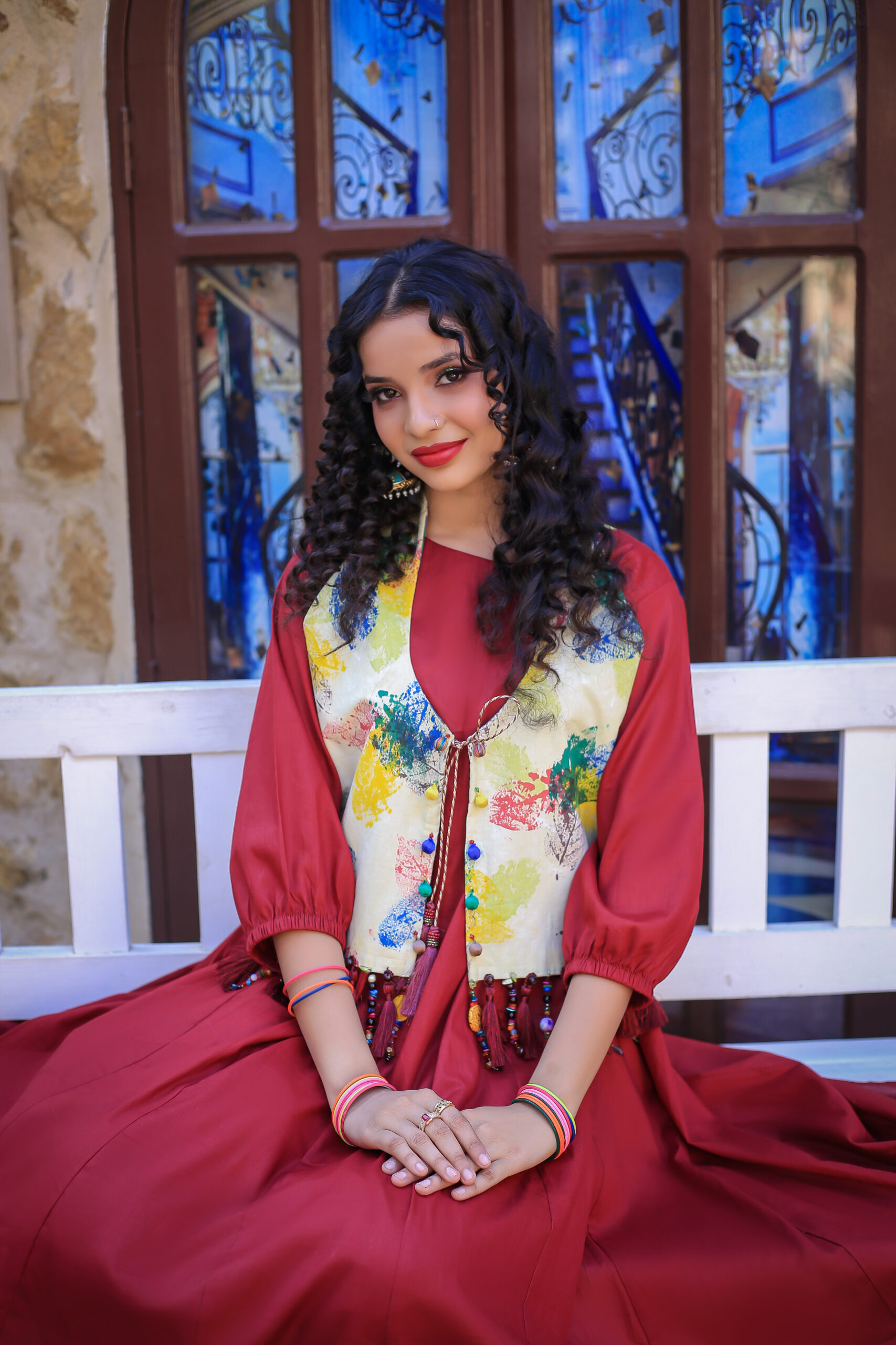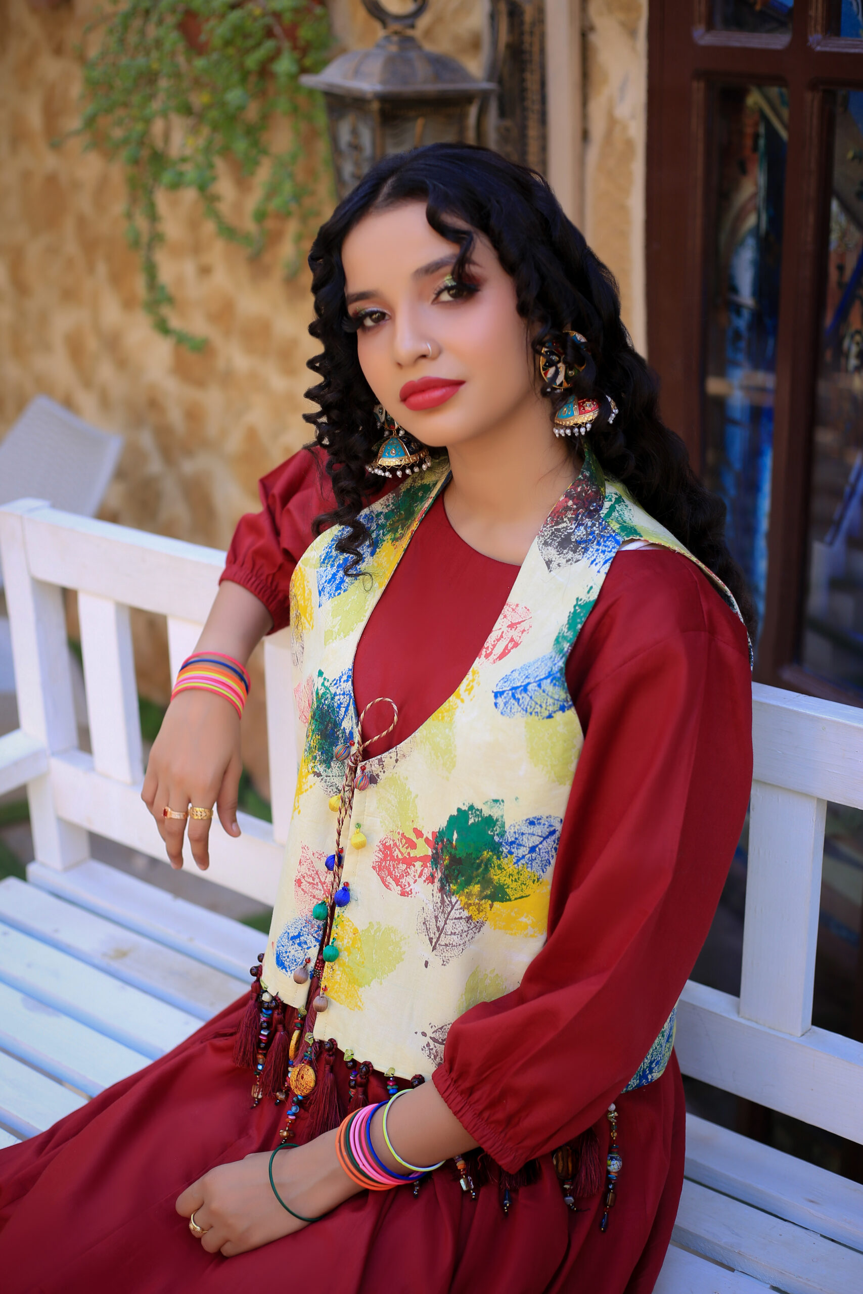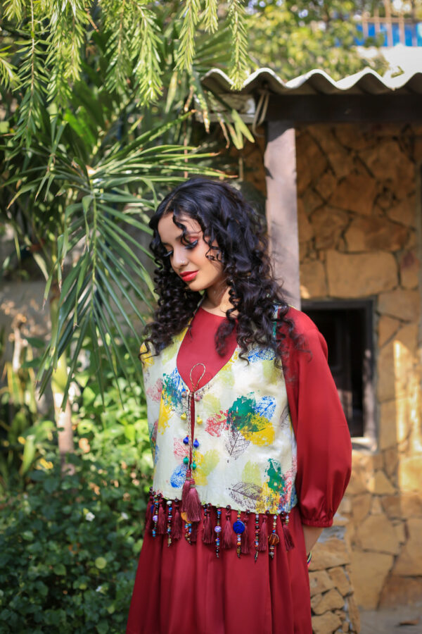 Make a bold statement with Ruby Foliage—a striking deep red ensemble paired with a vibrant, nature-inspired waistcoat. Featuring playful tassel detailing and a flowing silhouette, it’s the perfect blend of traditional charm and modern flair