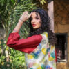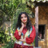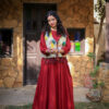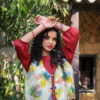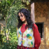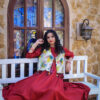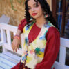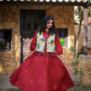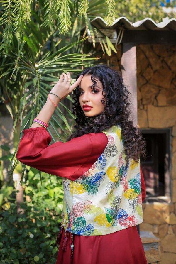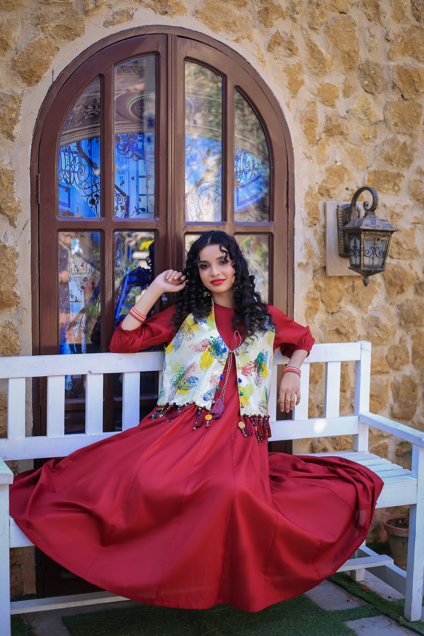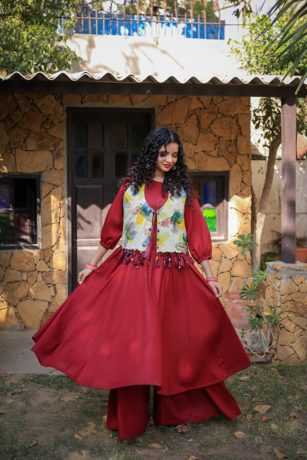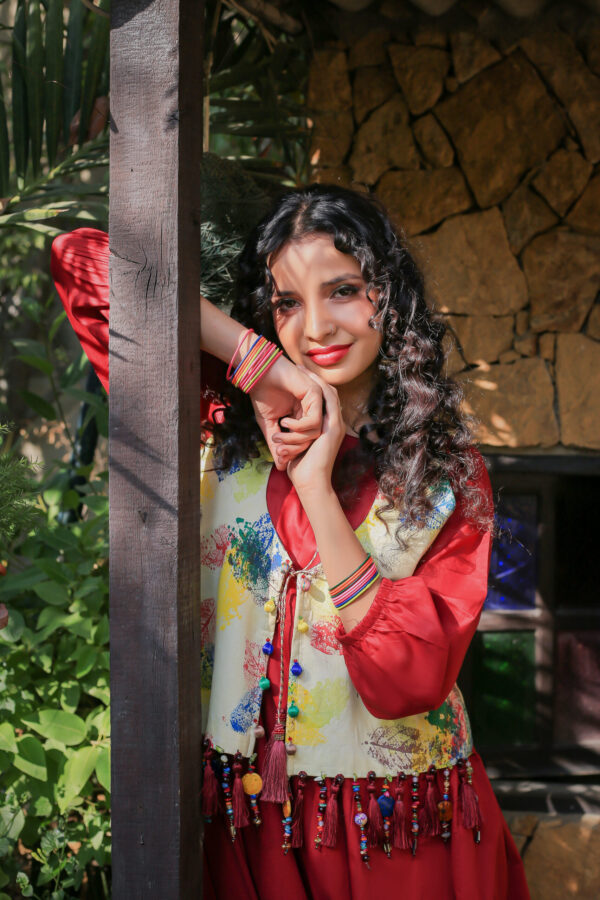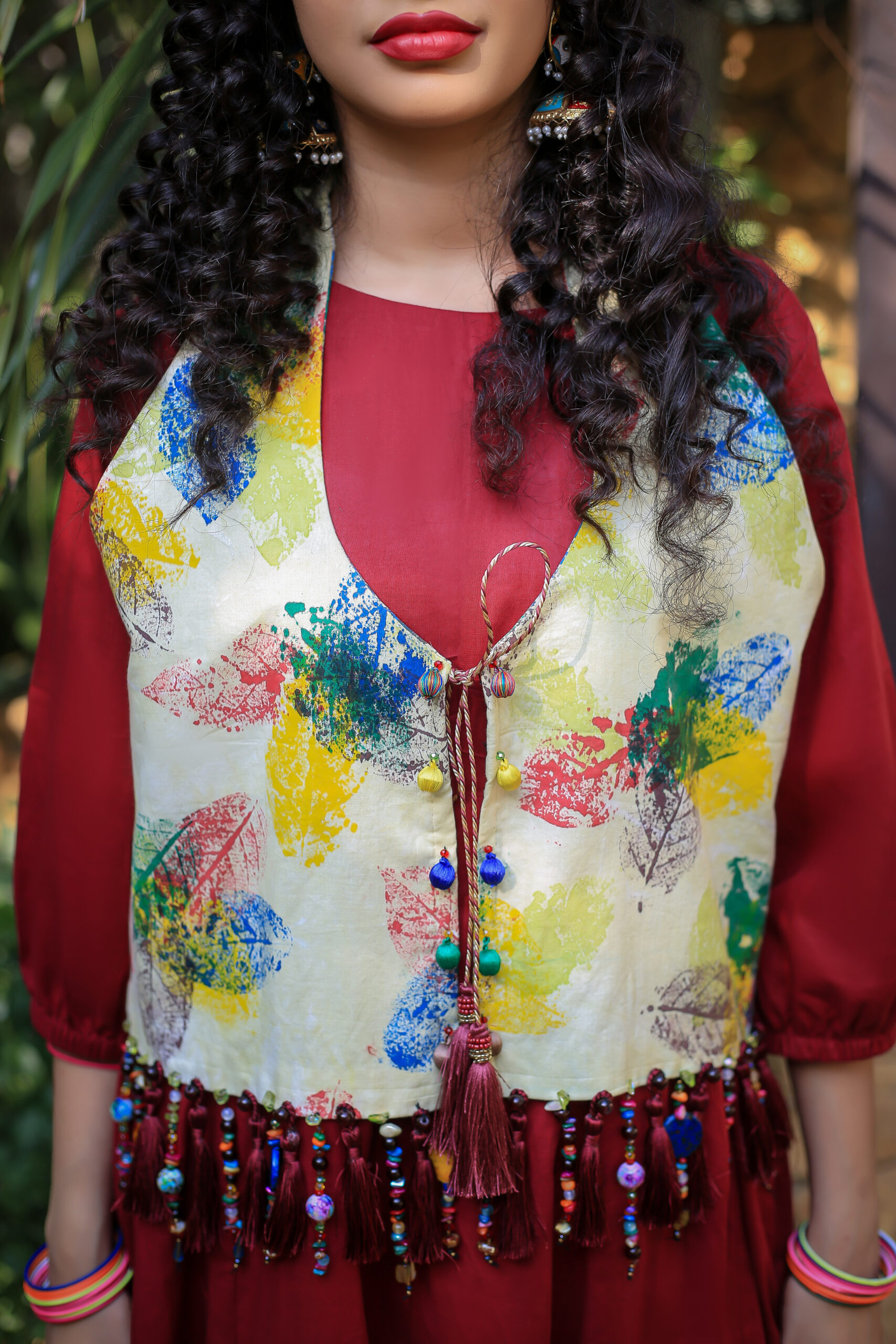 Make a bold statement with Ruby Foliage—a striking deep red ensemble paired with a vibrant, nature-inspired waistcoat. Featuring playful tassel detailing and a flowing silhouette, it’s the perfect blend of traditional charm and modern flair