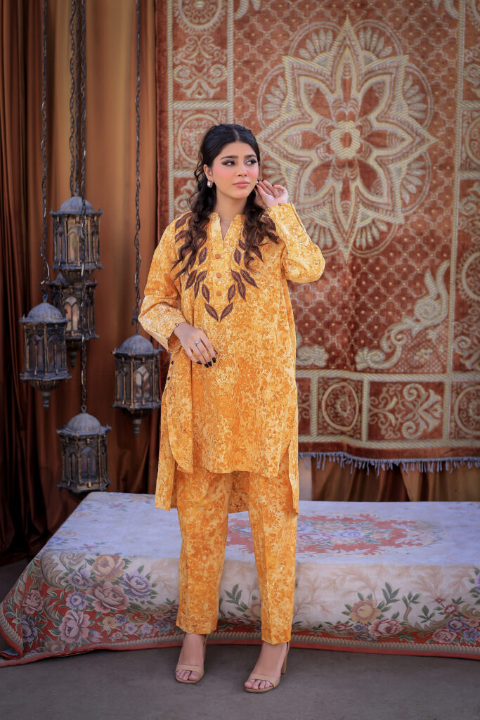 Make a statement with this stunning three-piece ensemble, featuring a long frock, a stylish jacket (koti), and loose, flowing palazzo pants. Crafted from 100% pure cotton using eco-friendly methods, this dress combines comfort with artisanal elegance. The koti showcases a fresh, contemporary design, naturally dyed in soft hues, and adorned with delicate mulberry-inspired floral motifs. Elegant tassels add a unique, playful touch, making this outfit a perfect blend of modern style and handmade charm.