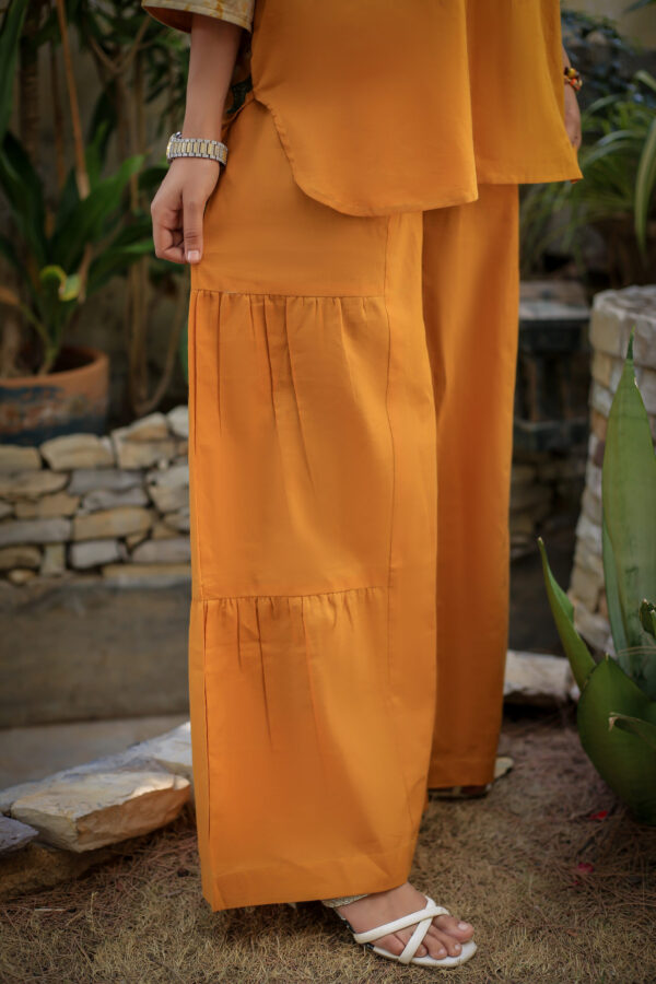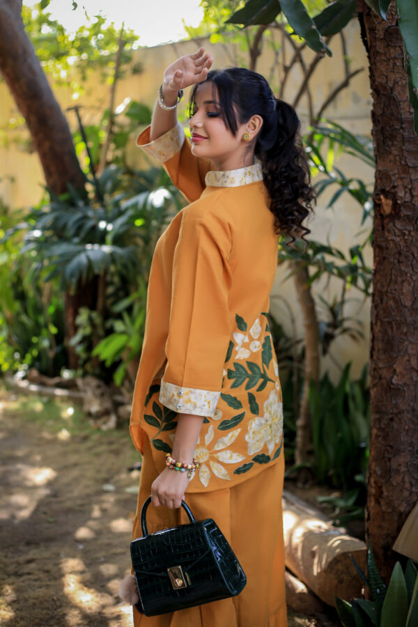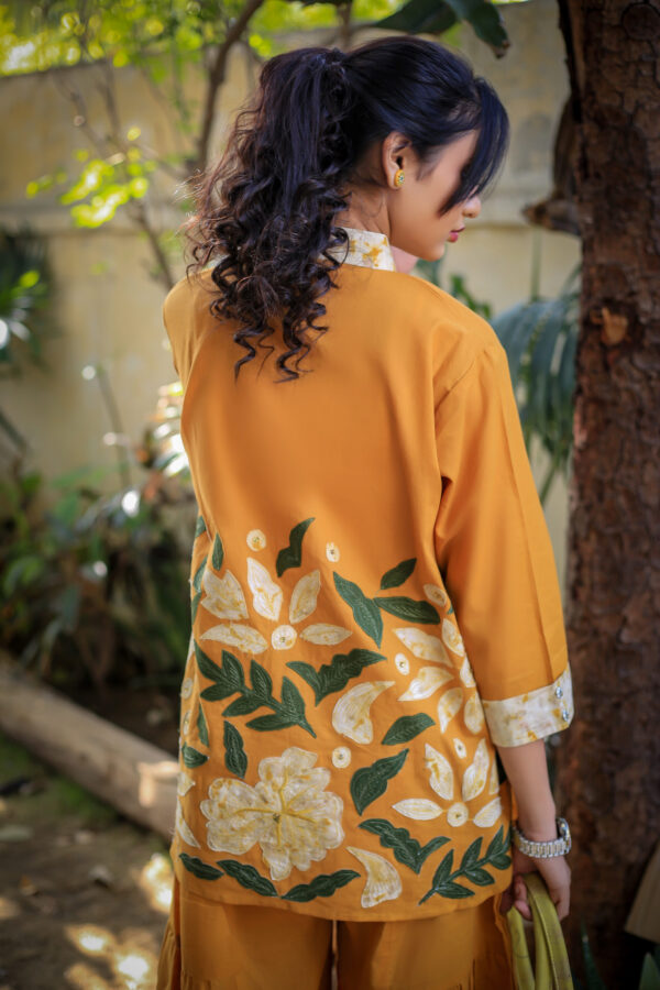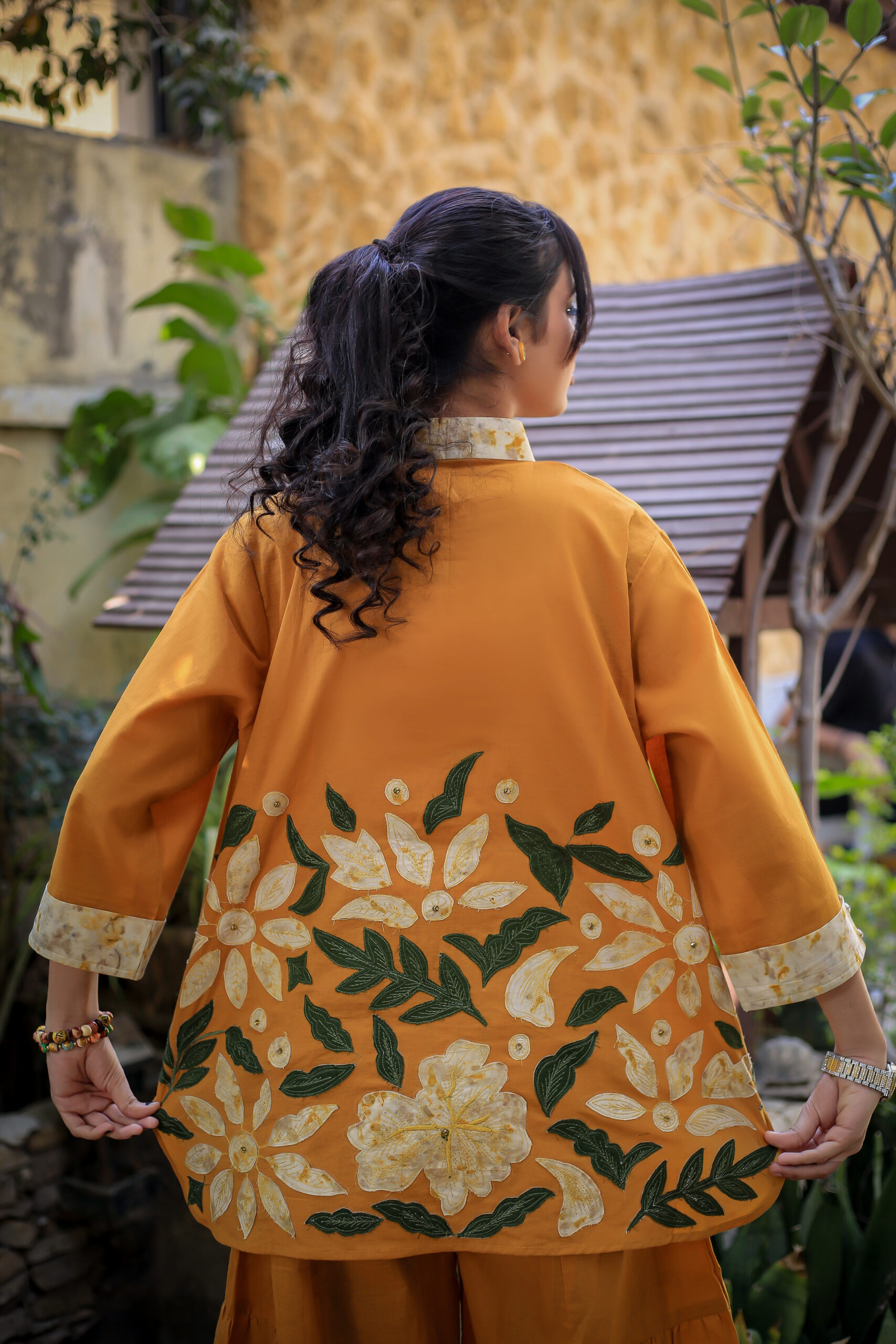 Step into effortless elegance with this chic two-piece set, featuring a short shirt paired with relaxed palazzo pants. Made from 100% pure cotton, this outfit combines comfort with artisanal charm. The back of the shirt is adorned with a striking embroidered patch, eco-friendly dyed with vibrant red and delicate marigold tones, adding a pop of color and a unique handmade touch. Perfect for those who love modern style with subtle, handcrafted details.