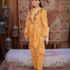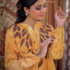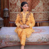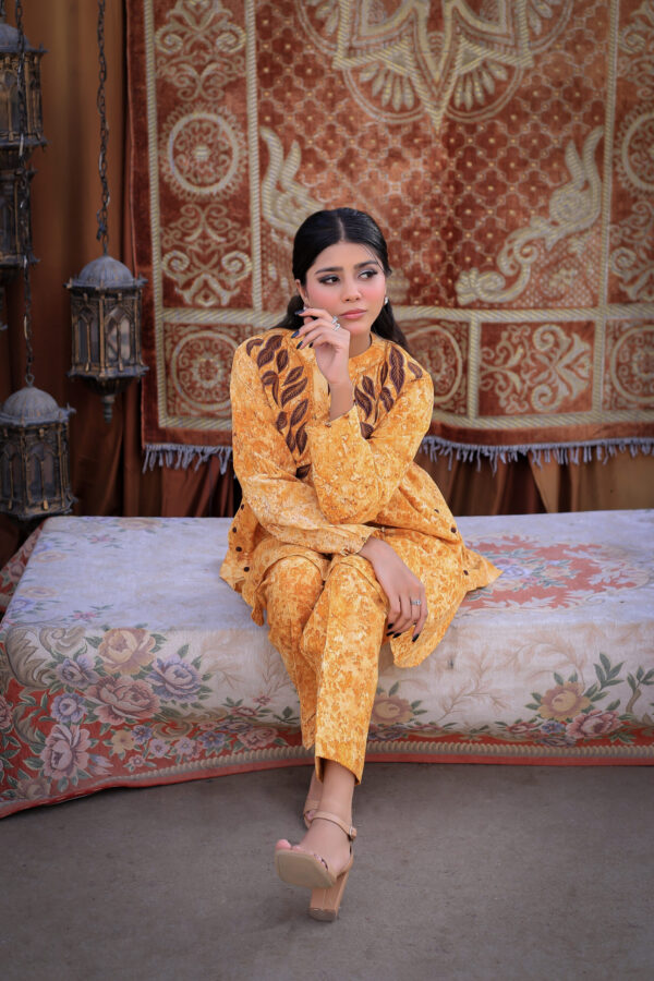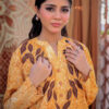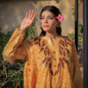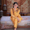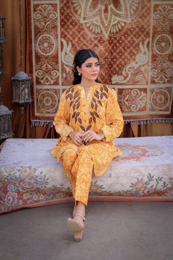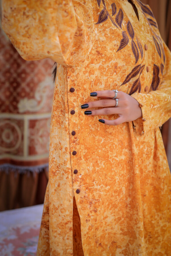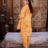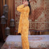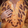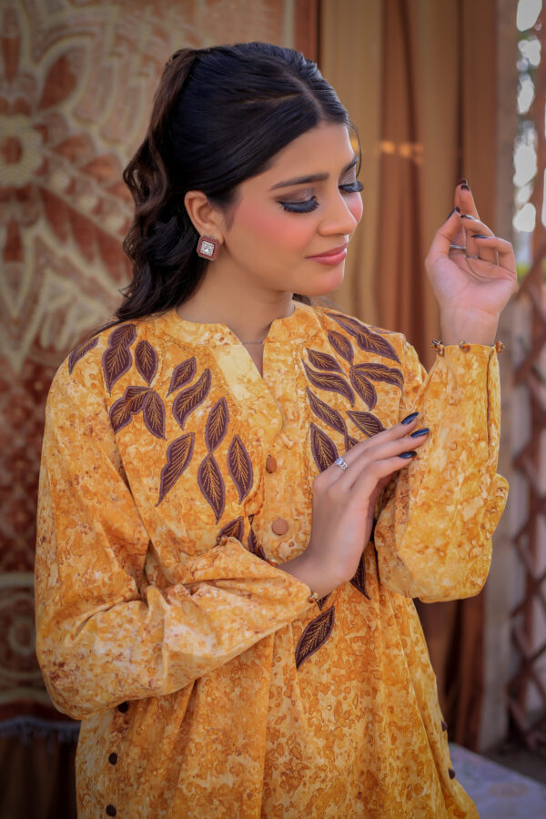 Sophistication from every angle. Mustara features a chic high-collar front with loop detailing, but the real surprise is the back—a stunning, oversized floral appliqué with intricate leaf embroidery. This mustard co-ord set is a true statement piece for the modern woman.