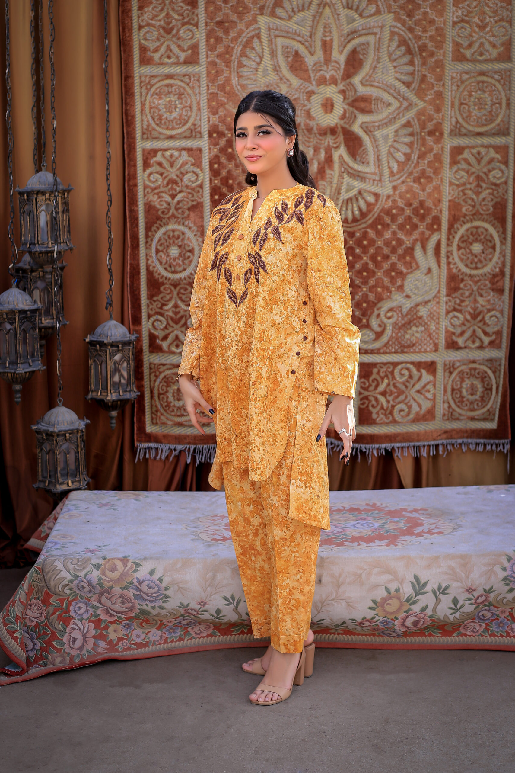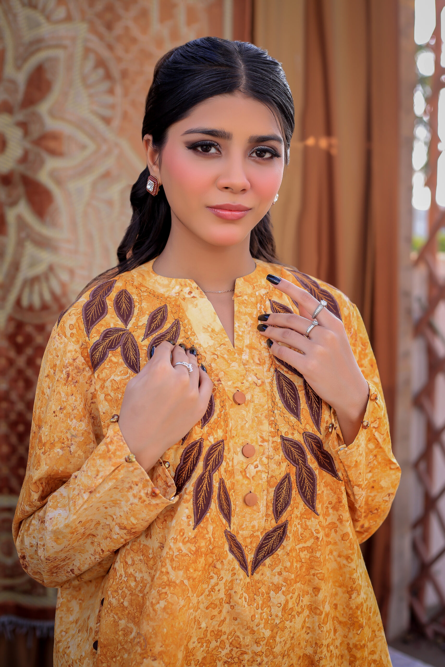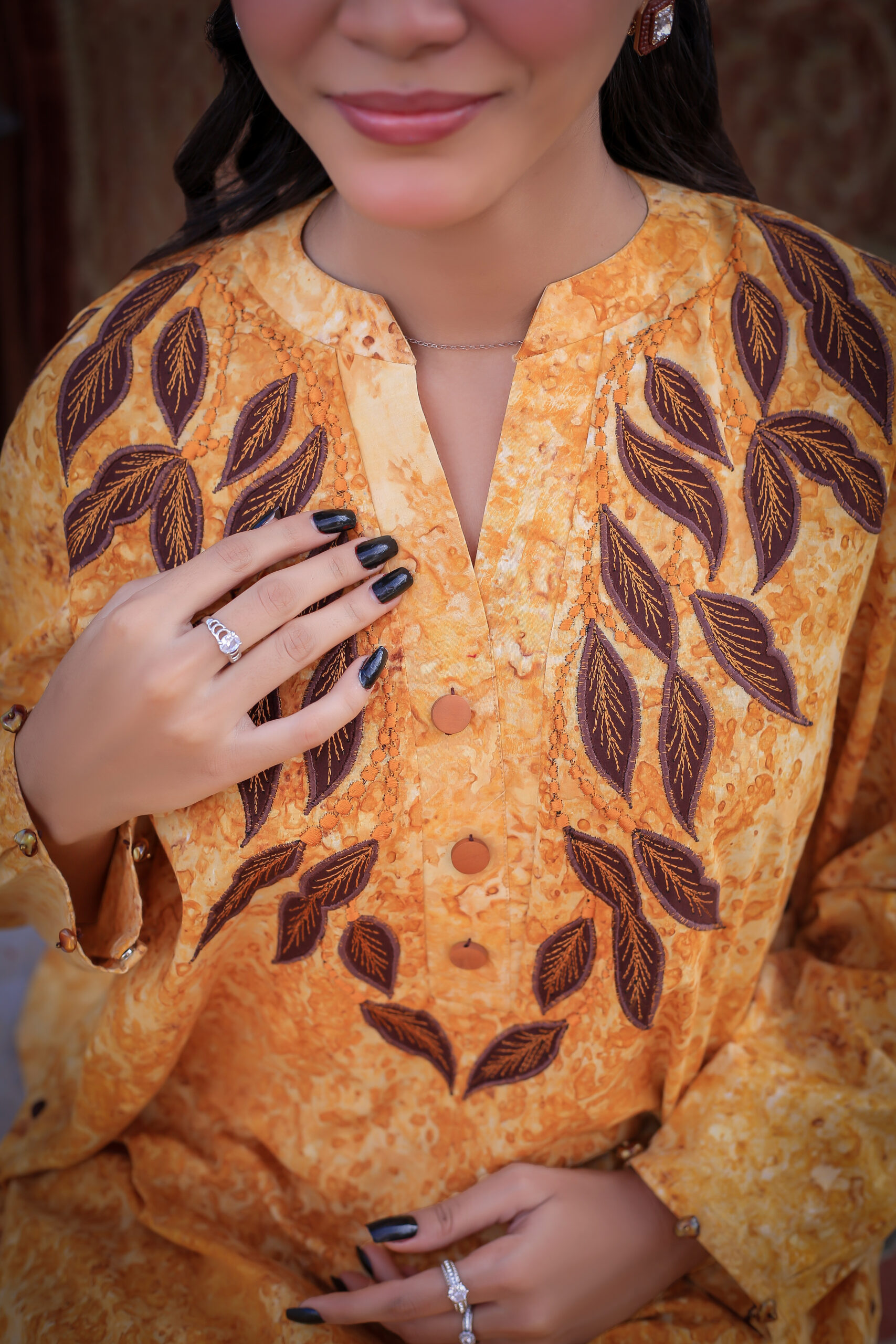 Sophistication from every angle. Mustara features a chic high-collar front with loop detailing, but the real surprise is the back—a stunning, oversized floral appliqué with intricate leaf embroidery. This mustard co-ord set is a true statement piece for the modern woman.