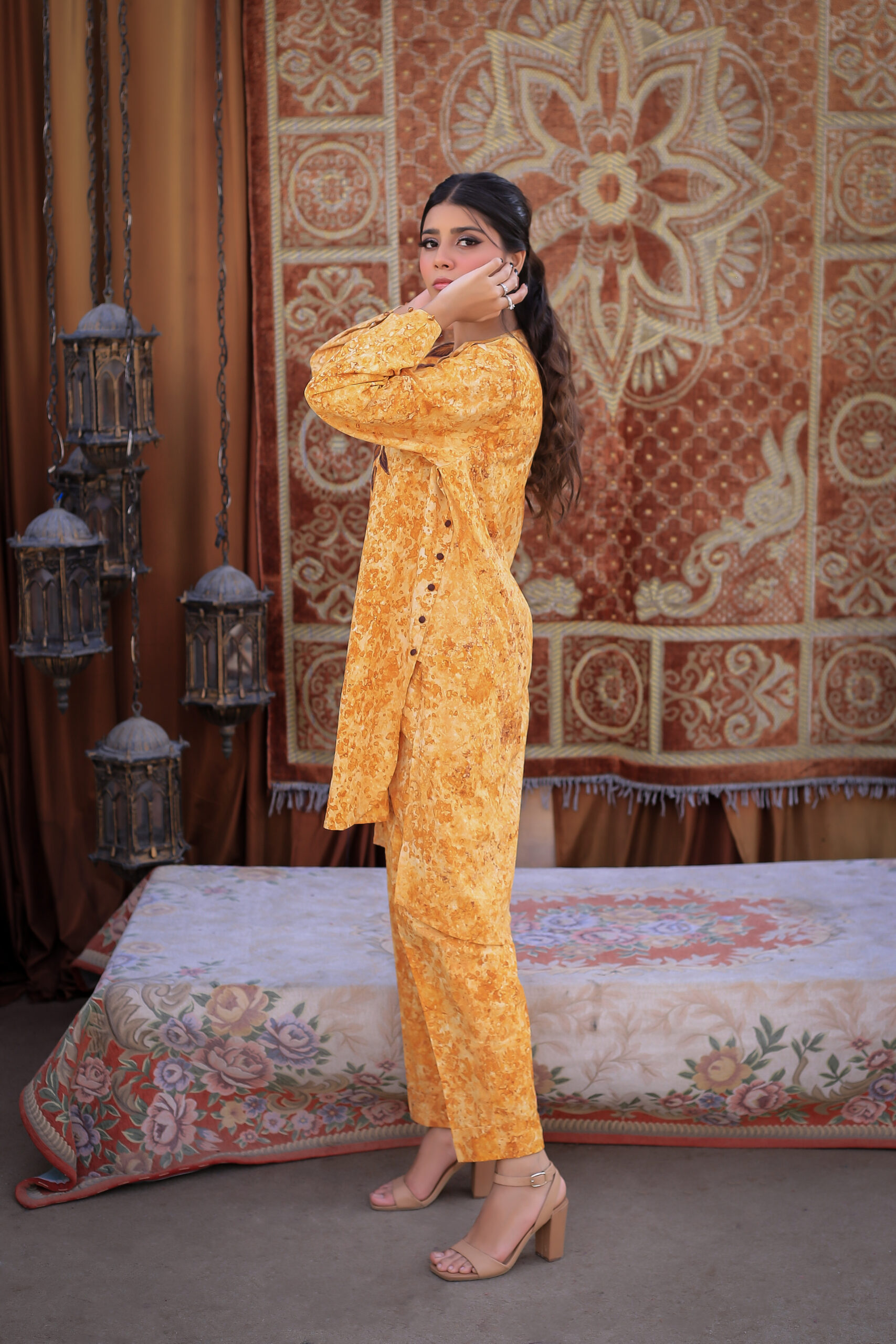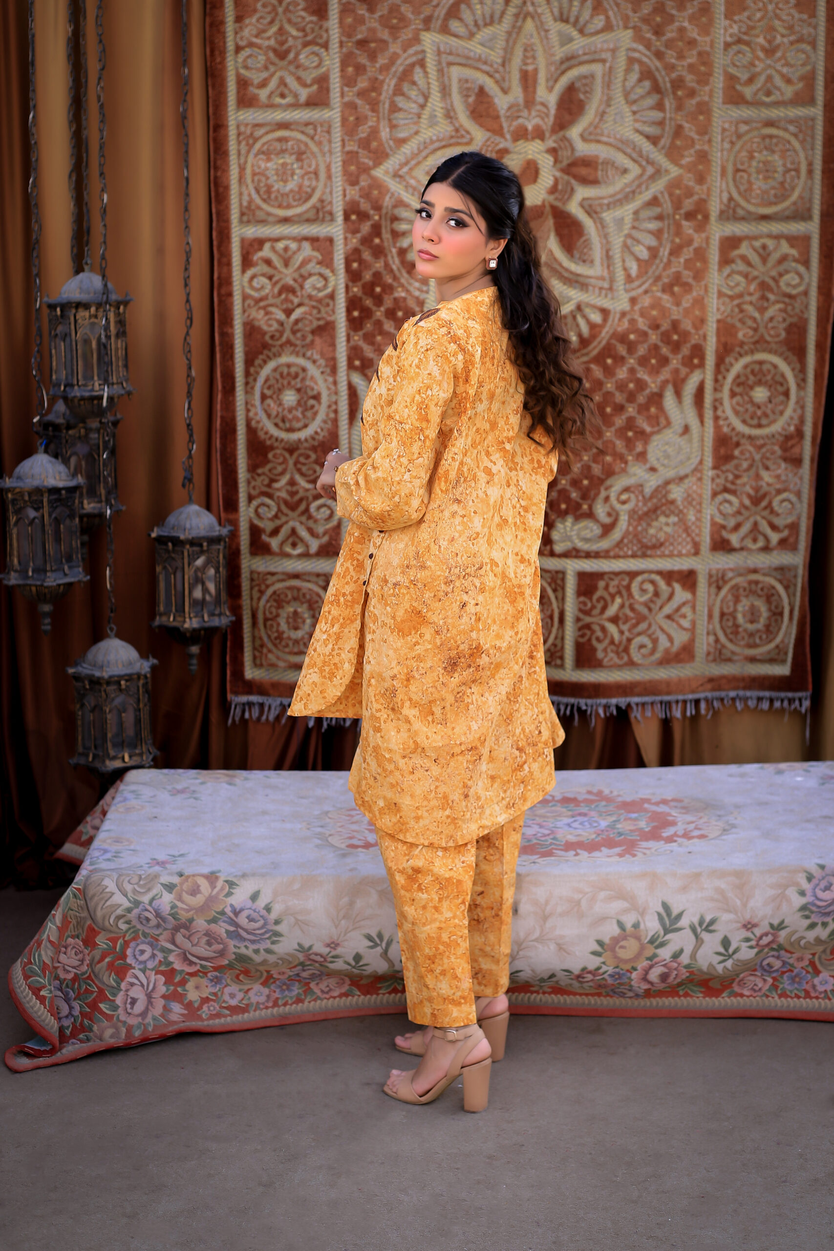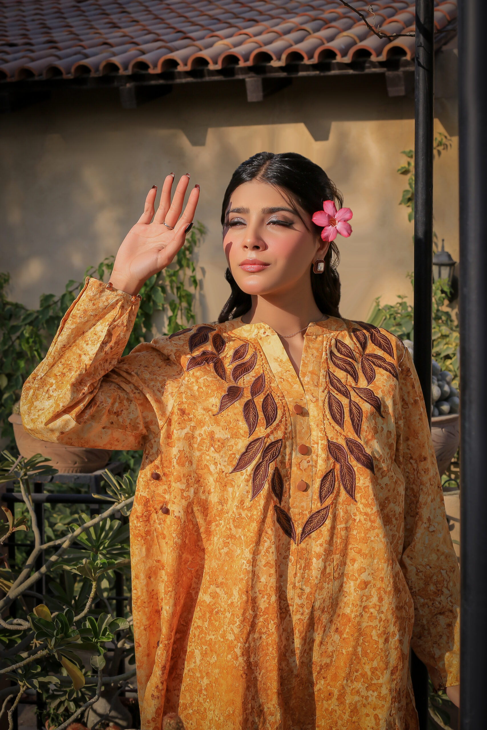 Sophistication from every angle. Mustara features a chic high-collar front with loop detailing, but the real surprise is the back—a stunning, oversized floral appliqué with intricate leaf embroidery. This mustard co-ord set is a true statement piece for the modern woman.