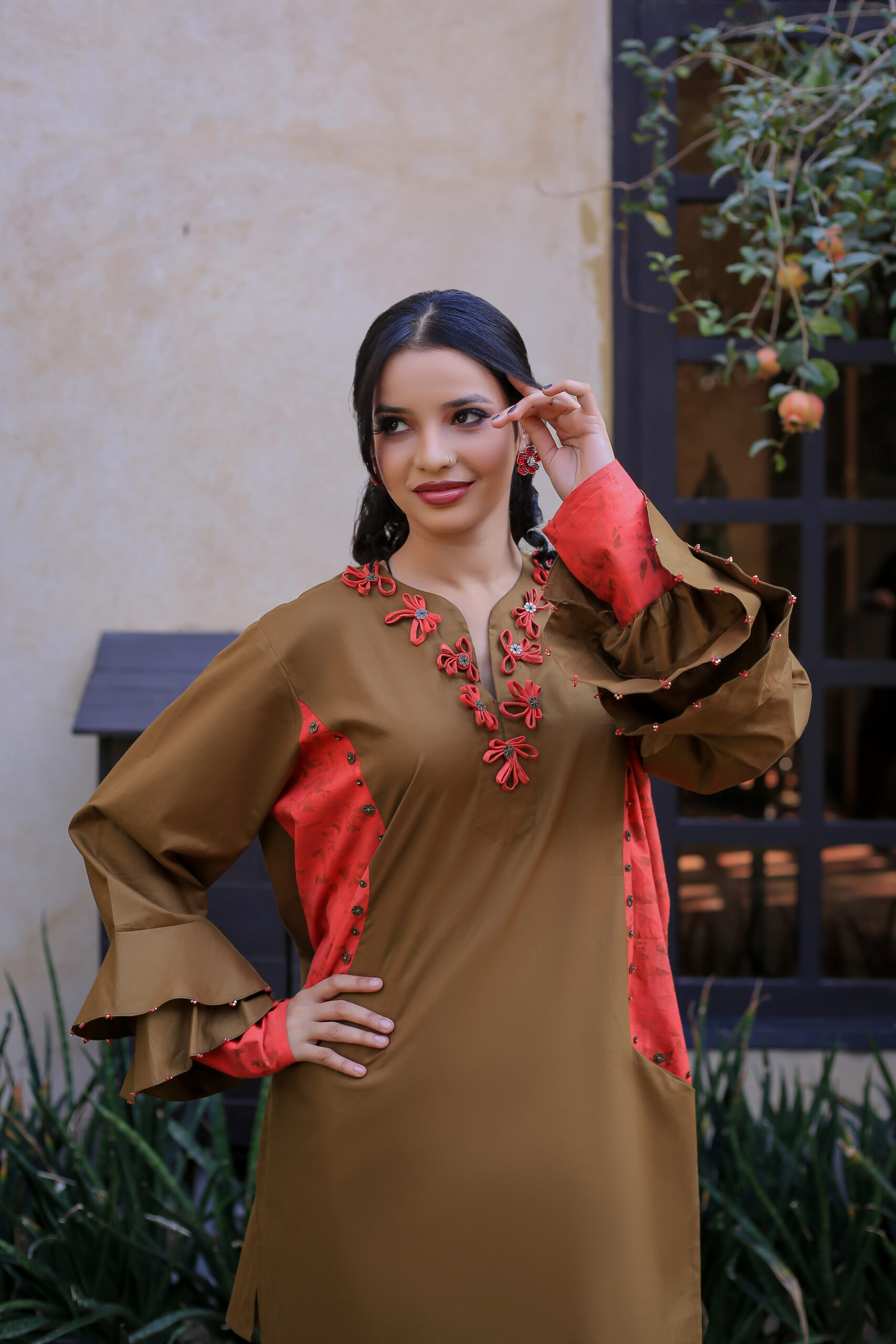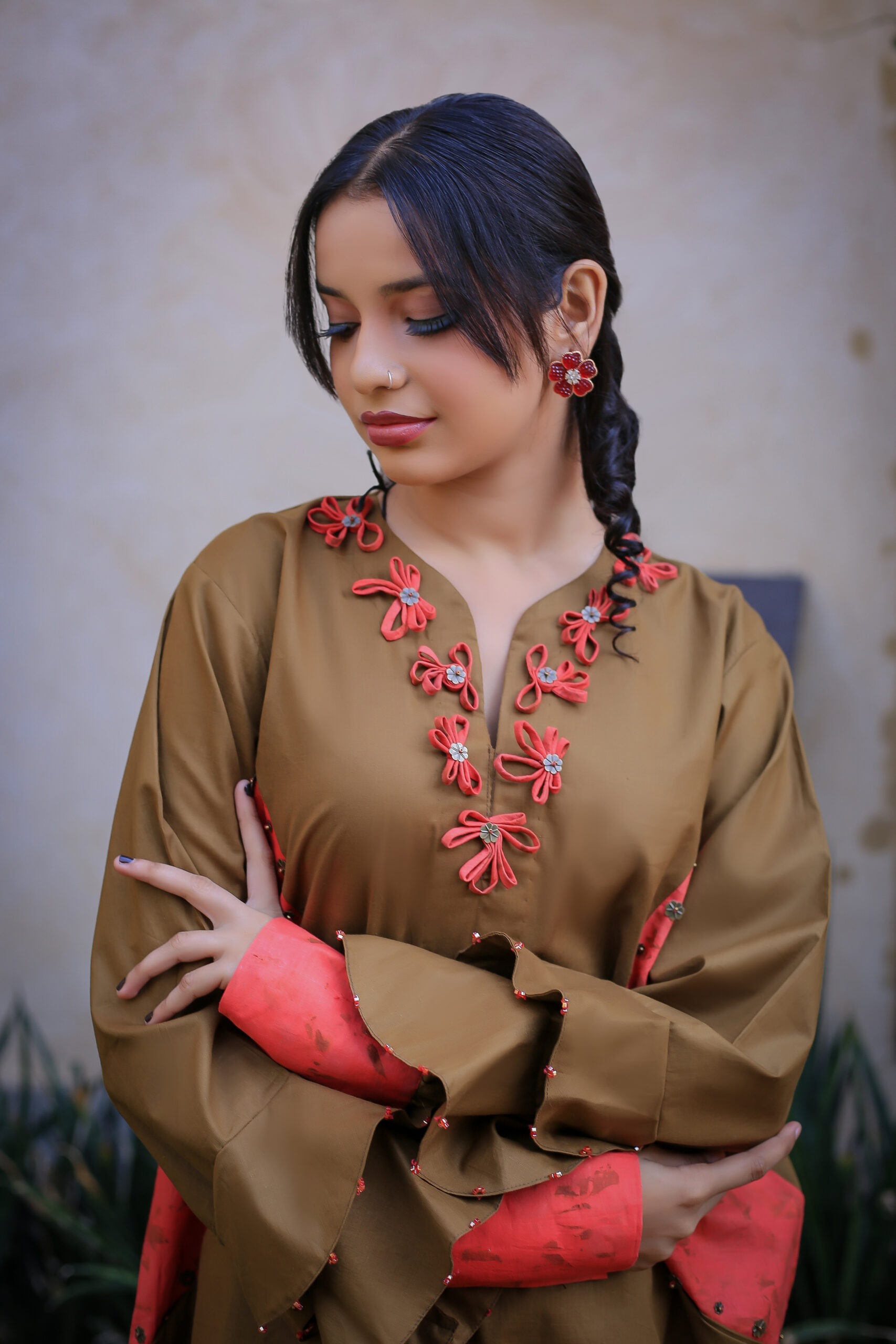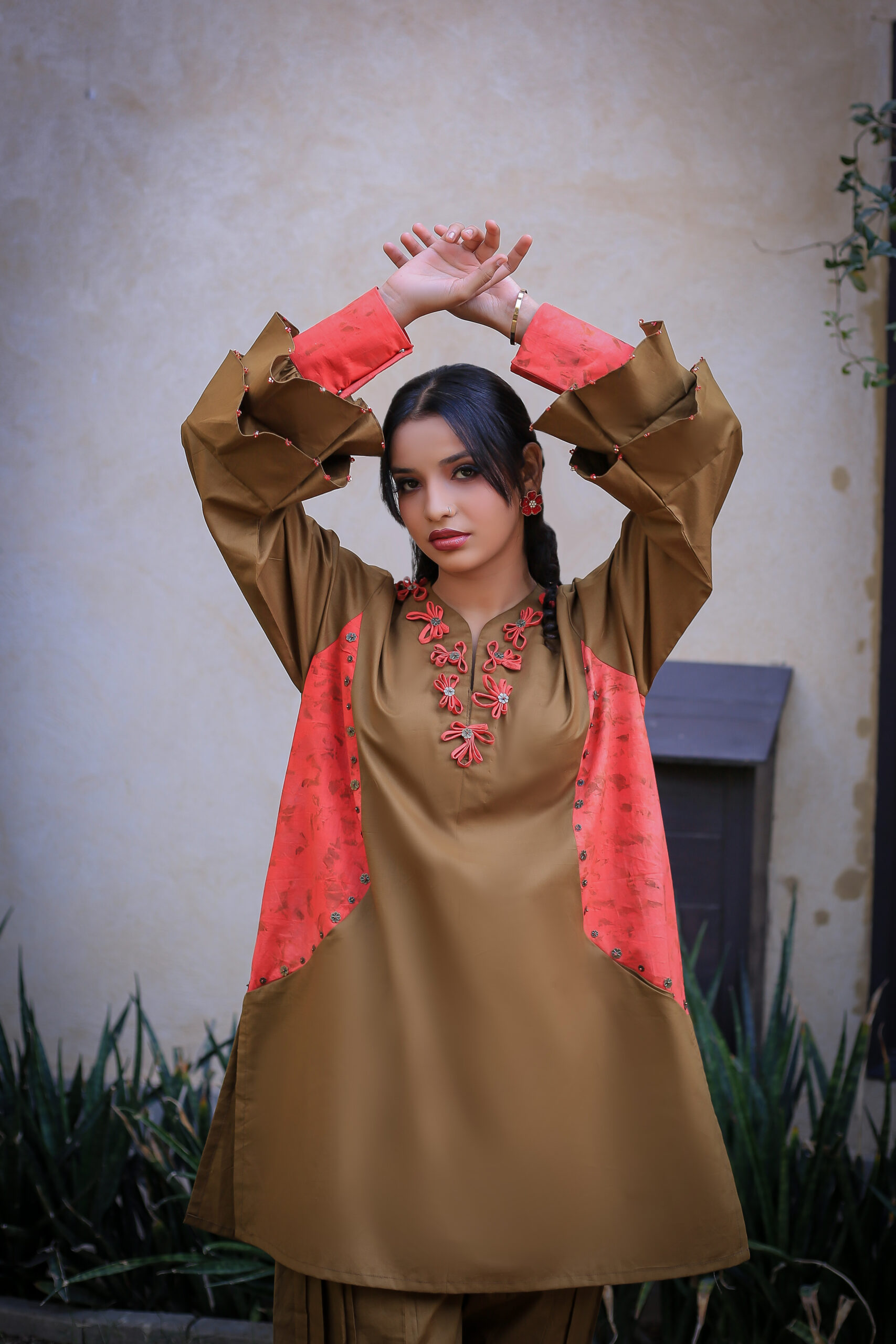 Discover the earthy charm of Auribear—an olive-bronze co-ord set that redefines fusion wear. Featuring vibrant coral floral appliqués on the neckline and statement tiered ruffle sleeves, this set paired with pleated dhoti-style pants is a masterclass in modern ethnic chic.