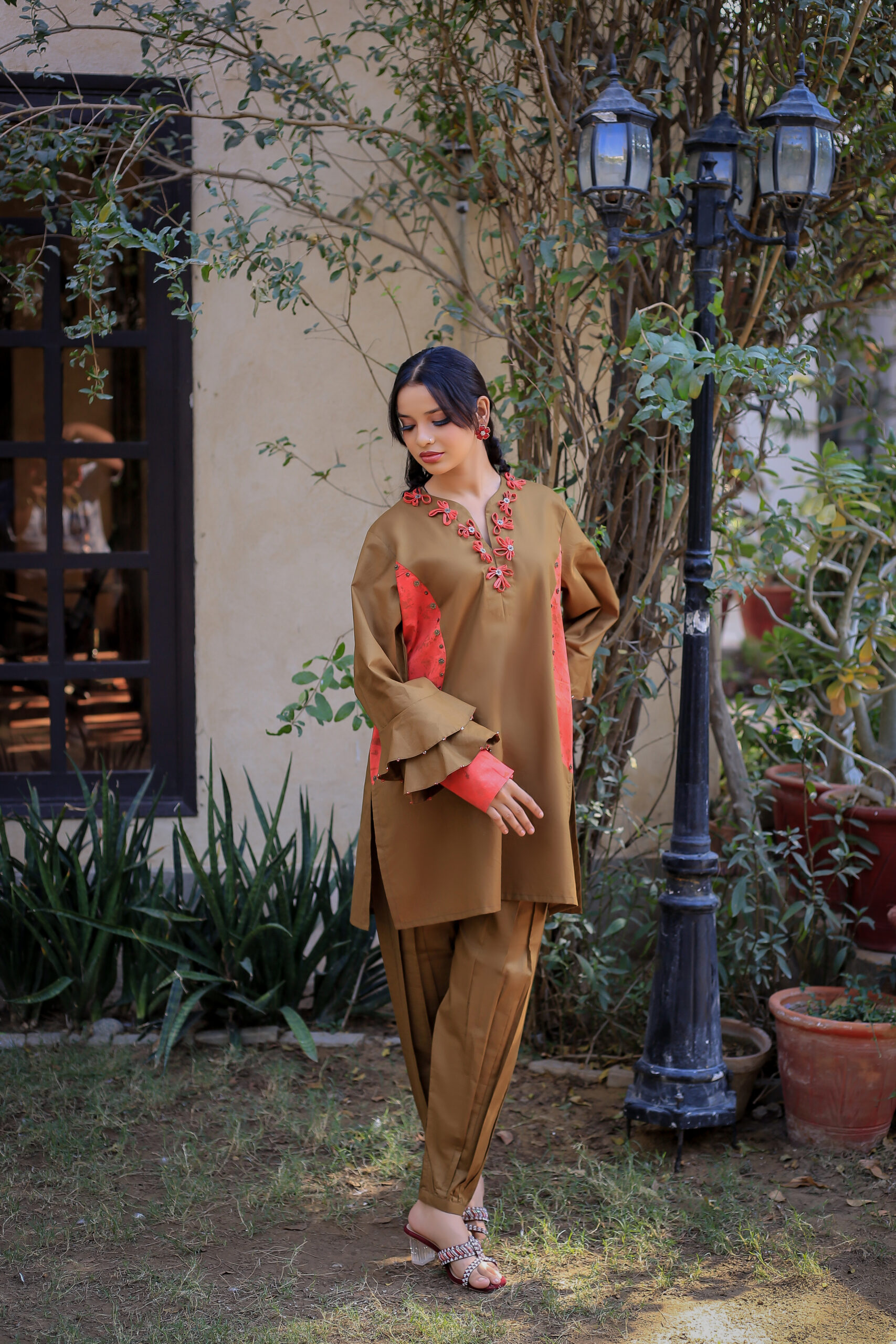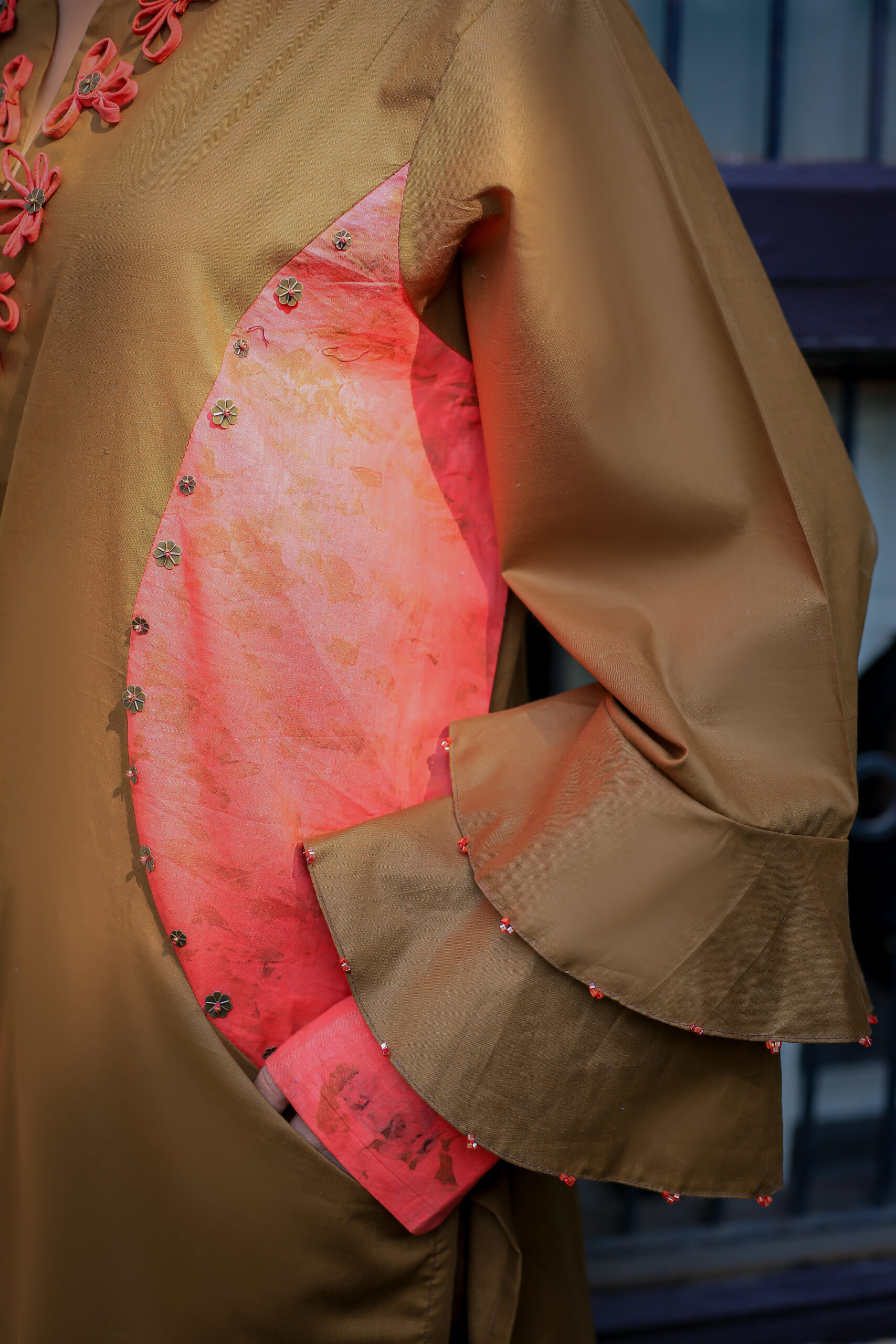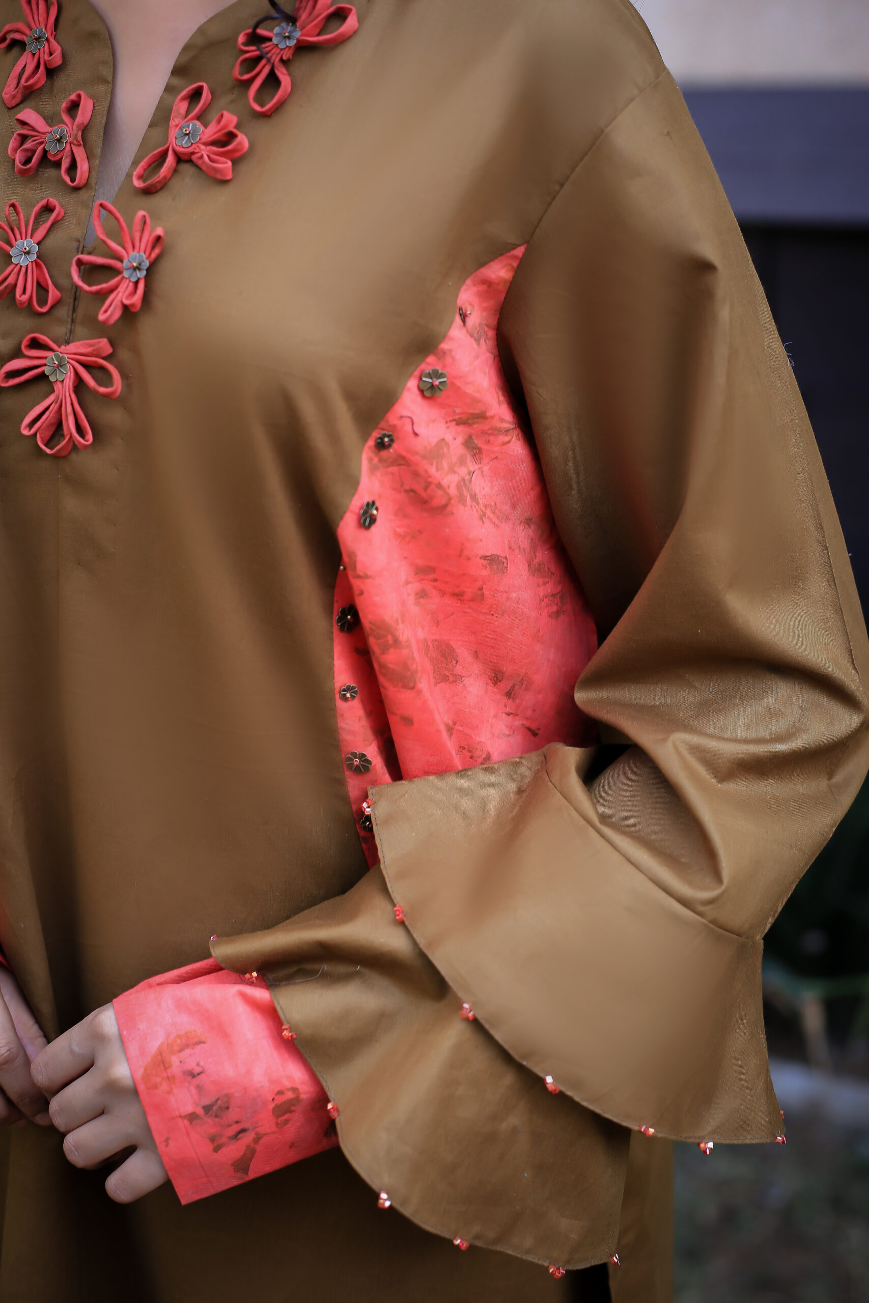 Discover the earthy charm of Auribear—an olive-bronze co-ord set that redefines fusion wear. Featuring vibrant coral floral appliqués on the neckline and statement tiered ruffle sleeves, this set paired with pleated dhoti-style pants is a masterclass in modern ethnic chic.